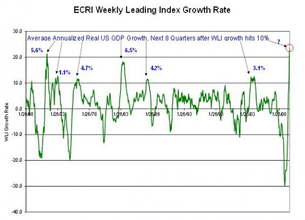Their best known indicator is called the Weekly Leading Index (WLI) and in recent weeks it has risen to record levels. This indicator is telling us some important things. It is telling us the recovery is at hand. It is telling us not to expect a double-dip recession anytime soon, contrary to the forecasts of many economists. And it is telling us to expect to a far more robust economic recovery than almost anyone expects.